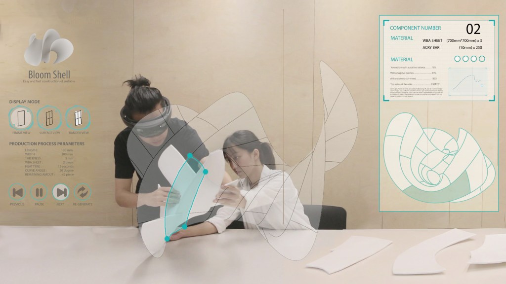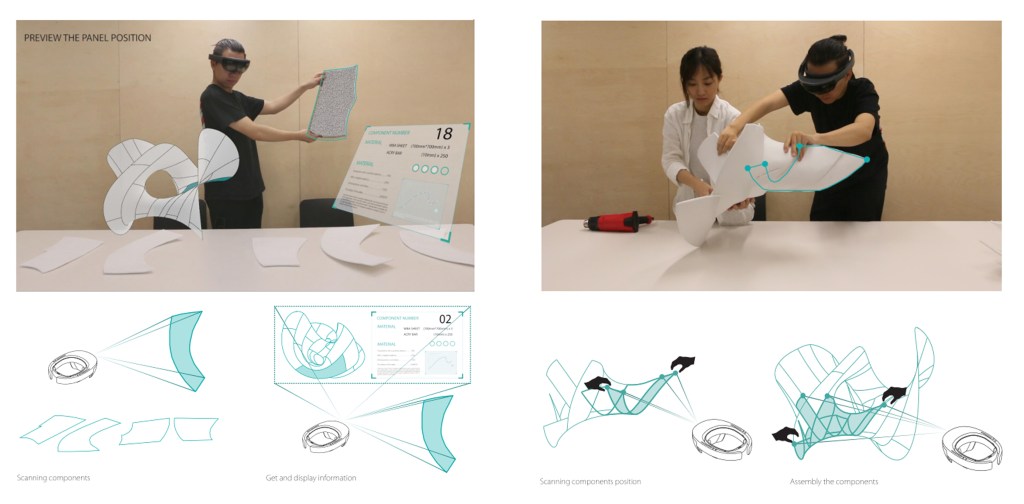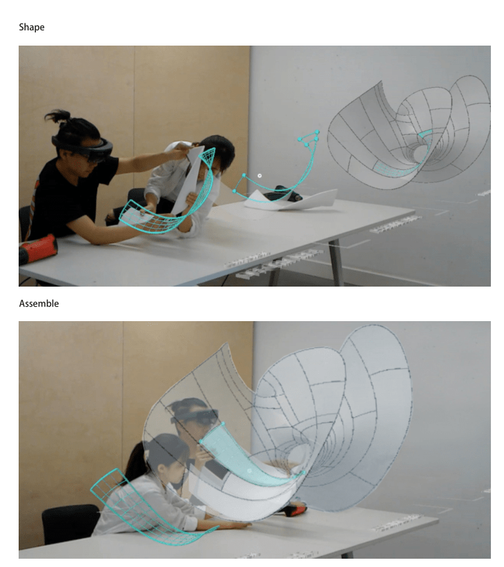 AUGMENTATION APPLICATION For the past, we used AR technology to help us do a lot of things in diverse process.But it is too complicated and difficult to control precisely in each step.So we wanted to optimize the application of augmentation. For our new martial and workflow, we can just apply AR to help us simply shape each component and assemble them together,which means the accuracy and operation convenience boot. Fologram is the most convient way to experience 3D content through hololens in mixed reality for now. It is used to collaborate with multiple devices to model in mixed reality, interact with holograms in real time as well. In the project, we combine the screen view with the actual mode through holographic in augmented reality space (NExT Lab.). At the beginning of the project, fologram software can also employ a device’s sensor to identify the shape of every single panel then send data back to the computer. The computer then displays the details of each panel for the user , such as position, sort number, and so on. At the same time, fologram technology is used to add markup or change to 3D model in mixed reality space. When two devices run a fologram program at the same time, they can cooperate in real time to complete the modelling work.