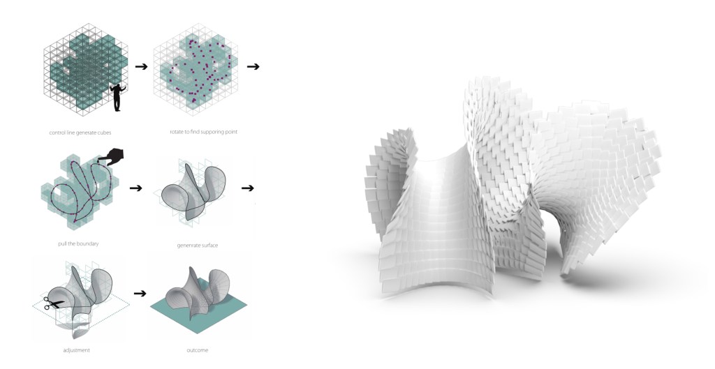 In this scenario, we continue to use the rainflow system to non-analyse the designed package surface and generate a well-structured boundary. Adjust the density of the rainflow line and make the dividing line a part of the design. At the same time, the adjusted lines and the components are combined with each other, and the boundaries of each other are pasted to make the structural parts more reasonable and substantial. As it is expected to grow later, we just make it as an origin form. Ideally, we can overlap more components to make it grow to different geometry. We want to use a kind of geometry we designed before to truly test if this method can work and how well it works. The form showed blow is a part of pavilion we designed. So firstly we use rain flow analysis system to extract its’ structure principle lines as the panel seams and growth direction.After that , we used rectangular as the basic element to penalize it.So we can get many components. As it is expected to grow later, we just make it as an origin form. Ideally, we can overlap more components to make it grow to different geometry.