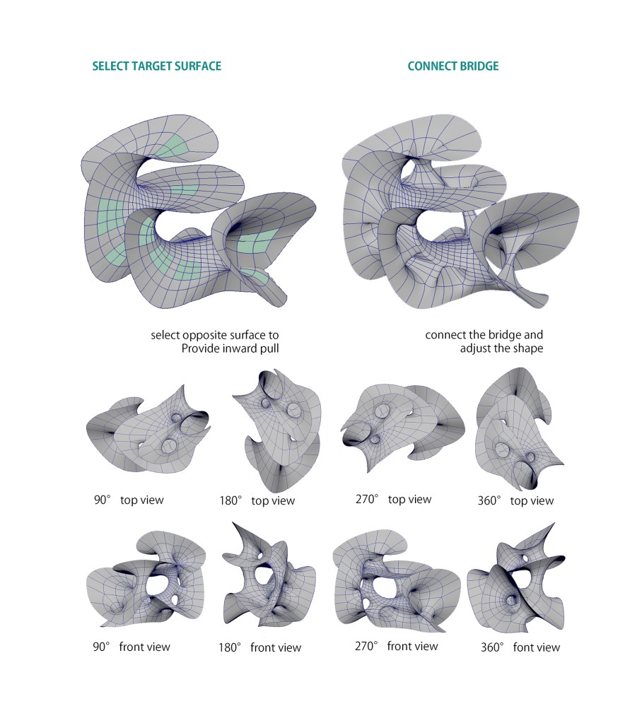 As the first proposal,we think our project has a huge potential to be a pavilion as it could stand by itself steady and posses a delicate inner space. After being casted, the surface would be solid and could be a shelter. “Bridges” between different surfaces could connect external environment and internal space of the pavilion, providing a comfortable space for wandering and staying.