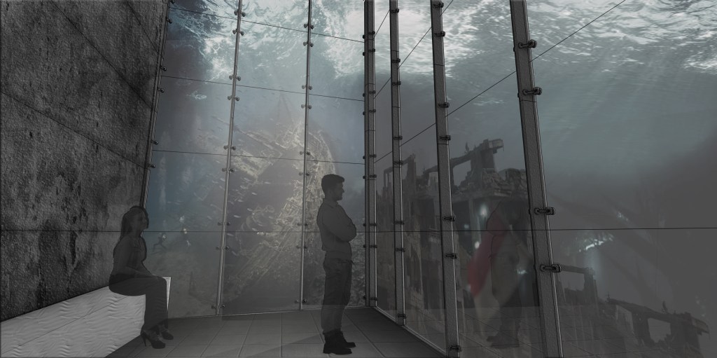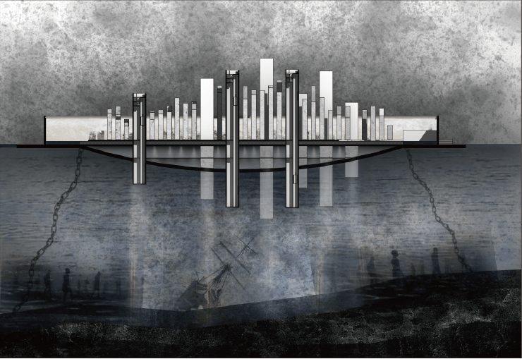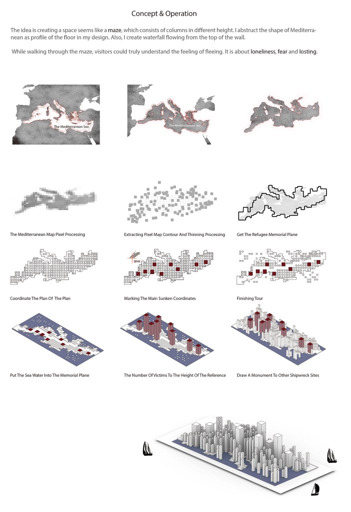 This design is to in memory of the Syrian refugees who suffered from Syria’s civil war and fled away from their hometown, on the arduous way of escape, the refugees do not know what the future will be, hundreds of thousand refugees were died in the smuggling process. Only when the photo of the three-year old Syrian refugee died in the smuggling process put on the Internet, did the world feel astonished. Only in 2015, there were almost 4000 refugees died in the smuggling process. They have no alternative that they have to flee away from their hometown. The site selection of this design locates at port of Latakia, Syria, where the most of refugees depart from. The major structure of the building floating on the Mediterranean which at a distance from the port. The visitors could take boat to the memorial, by visiting the memorial, the visitors could tangible experience the true feeling of the refugees. The building regards the concrete column as the main body, and surrounded by water curtain, which symbolized the feeling of isolation when shipwreck. The underwater portion showing the Maheno Wreck etc. I hope to arouse the attention of people to life and peace by this.