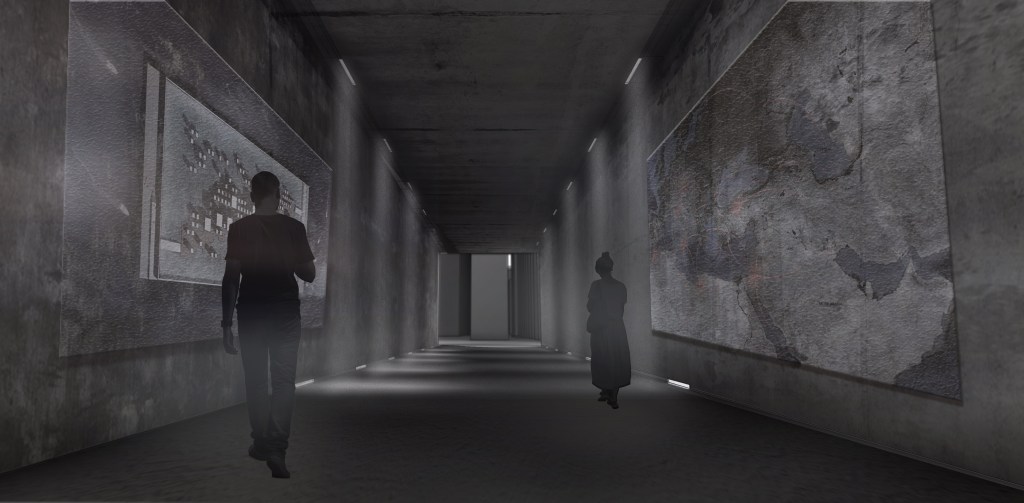 by boat. It help people to experience how lonely and helpless it is while floating on the sea, and waiting for the boat after visiting seems like looking forward for the hope. In addition, the building stands on the sea have little influence on the city. People can overlook it from a far distance. Narrow corridor leading to the maze. Waterfall fall from the top of the wall, and water surround the floor, walking through maze just like traveling through the Mediterranean. All those elements are aim to help the visitors imagine and experience what have happened to the refugees during the trip. Only when people felt these elements can they