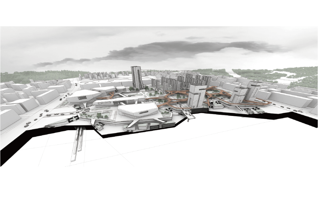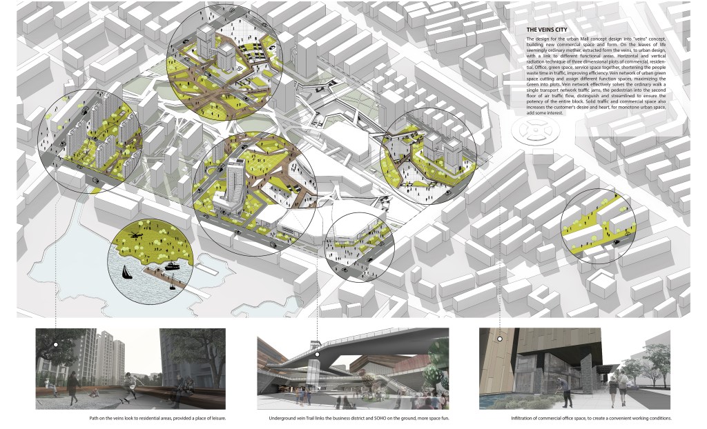 The design locates at Wenzhou Commercial City of Gongzhuling City, Jilin Province. Due to its monotonous and arbitrary design and interrelated interference streamline, it is difficult to form a stable business radiation system. The purpose of this design is to change the current status and forged a new spatial experience of CBD. The inspiration of The VENS CITY derives from the basic form of the vein. The leaf looks simple, but the structure is intricate. The vein connected the all parts, and sustains fundamental living demands of organism. To apply the vein into the design concept of the city, concatenated all the corners of the sophisticated blocks by using the most flexible design techniques, and worked out a reasonable and functional network disposal and communication streamline, forged a multi-layered, multidimensional spatial experience.